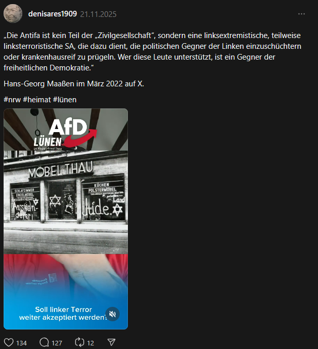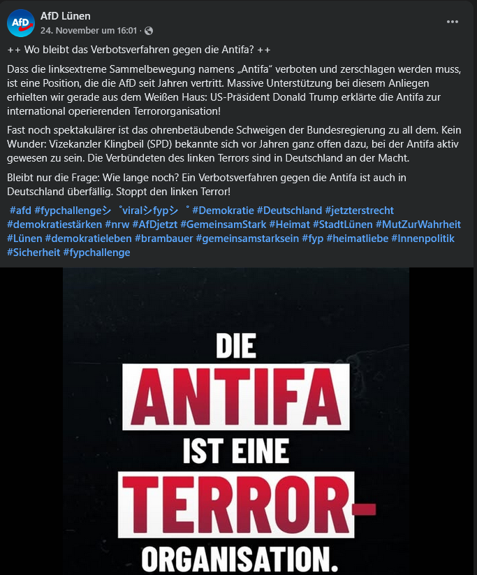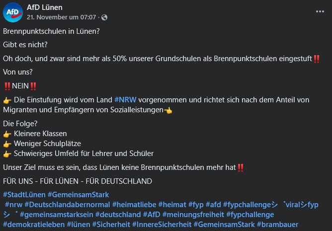 Die Social-Media-Aktivitäten der AfD Lünen – insbesondere von Denis Fellner – zeigen ein Muster aus Selbstinszenierung, Verzerrung, populistischen Narrativen und der gezielten Diffamierung politischer Gegner. Symbolpolitik ersetzt glaubwürdiges Engagement, historische Vergleiche verharmlosen NS-Verbrechen, und komplexe gesellschaftliche Probleme werden auf einfache Feindbilder reduziert. Statt konstruktiver kommunalpolitischer Arbeit dominiert Provokation, Emotionalisierung und das Streben nach Aufmerksamkeit. Dadurch trägt die AfD Lünen eher zur Spaltung als zur Lösung realer Probleme bei, wie so üblich.