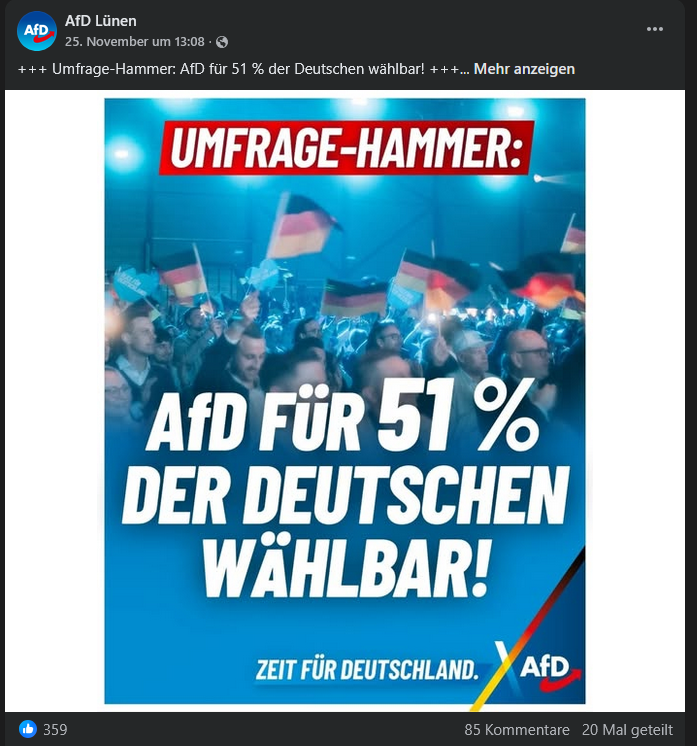 Ebenso oberflächlich geht die AfD Lünen mit Umfrageergebnissen um. In einem Facebook-Post wurde behauptet: „AfD für 51 % der Deutschen wählbar!“. Grundlage war jedoch eine Umfrage von FORSA bzw. INSA unter rund 1.000 bis 2.500 Personen, bei der lediglich der Anteil derjenigen sank, die die AfD grundsätzlich ausschließen würden. Das hat mit „51 % der Deutschen“ wenig zu tun. In der letzten Sonntagsumfrage lag die AfD bei 26 %.