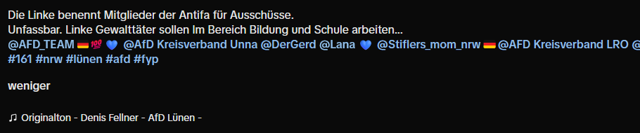 Auch in einem TikTok-Video suggerierte Fellner, die Partei Die Linke in Lünen würde angeblich „gewalttätige Antifa-Mitglieder“ in kommunale Ausschüsse entsenden. Dies ist eine klare Verleumdung, auch wenn keine Namen genannt wurden.