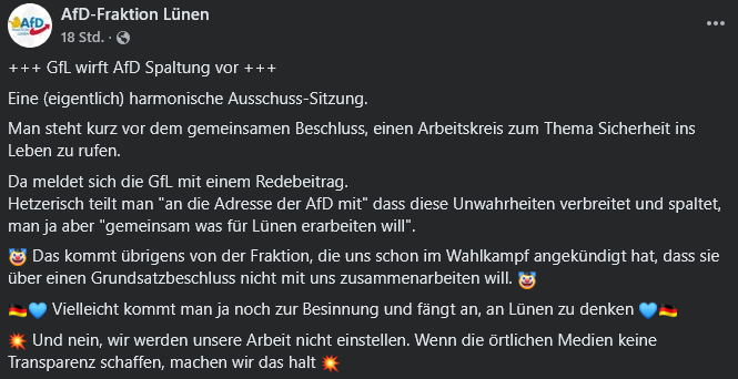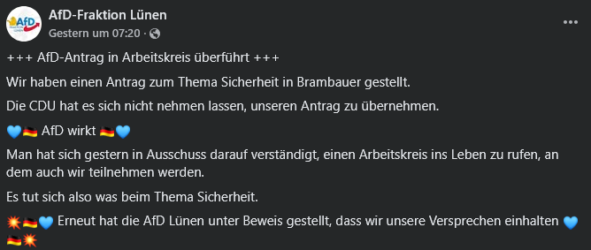 So verkündete die AfD-Fraktion Lünen auf Facebook bereits eine Zusammenarbeit mit der CDU-Fraktion für einen gemeinsamen Arbeitskreis, ein Widerspruch seitens der CDU blieb bislang aus. Beschlossen wurden entsprechende Pläne im Ausschuss für Ordnung und Sicherheit am 03.03.2026.